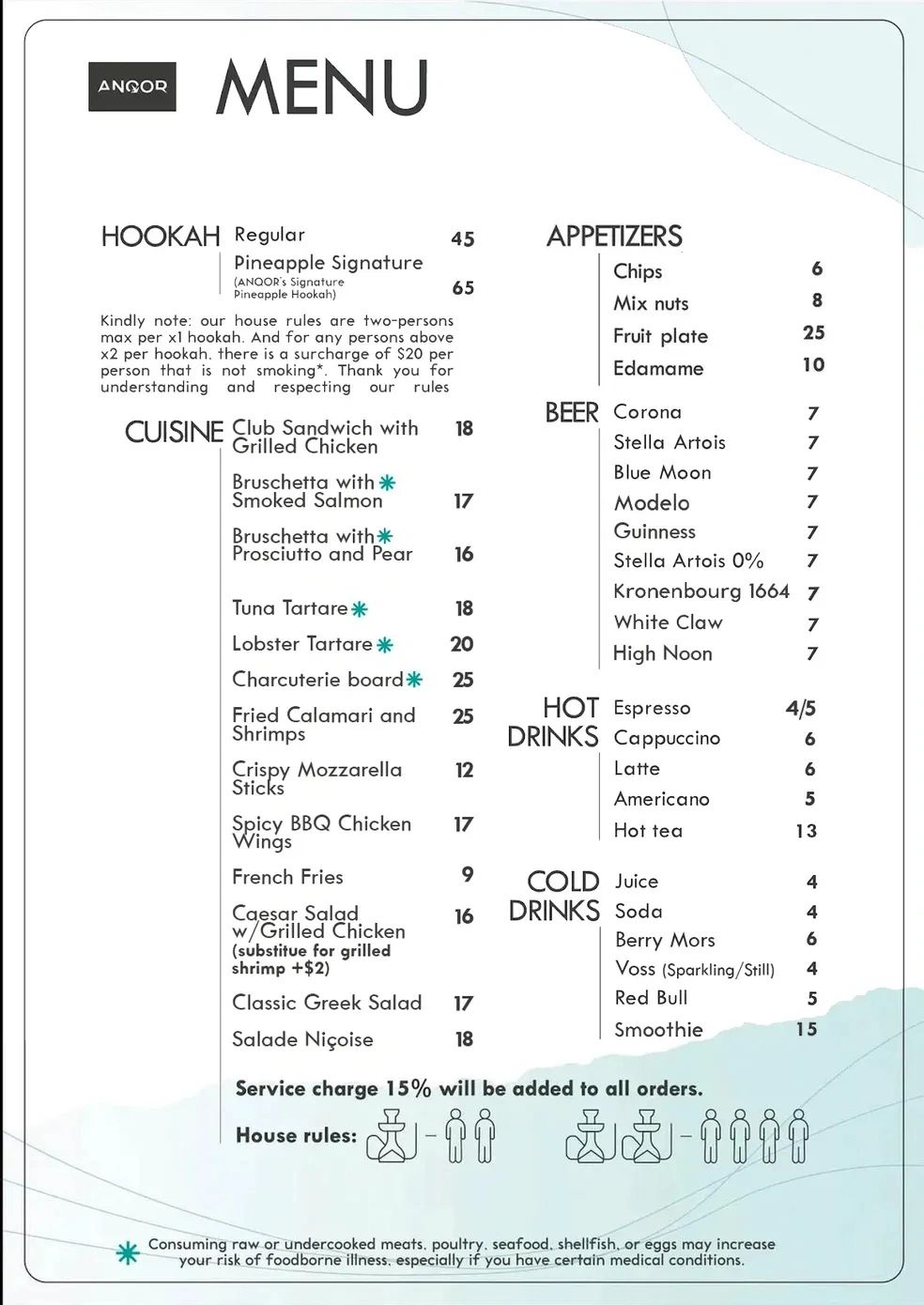 We love serving you Orlando's most high-end hookah experience, by law, you must be 21+ to enter. Our house rules are two-persons max per x1 hookah. Otherwise, for any person above x2 persons per hookah, we have a surcharge of $20 per person that is not smoking*